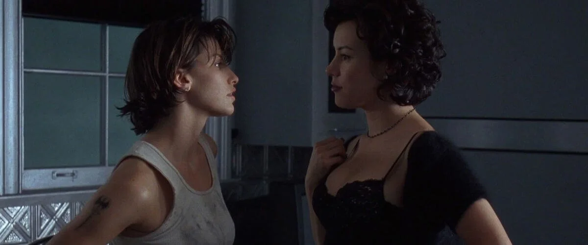 Released from a five-year jail term for "redistribution for wealth" Corky (Gina Gershon) doesn't waste any time in entering into a steamy love affair with her neighbour Violet (Jennifer Tilly). Together they concoct a scheme to steal millions of stashed mob money from Violet's unhinged boyfriend Caesar (Joe Pantoliano) and pin the blame on him... Before they went on to find huge commercial success with The Matrix, the Wachowskis had already wowed the critics with Bound: a gripping, stylish thriller that blends crime, suspense, and a passionate romance at its core.